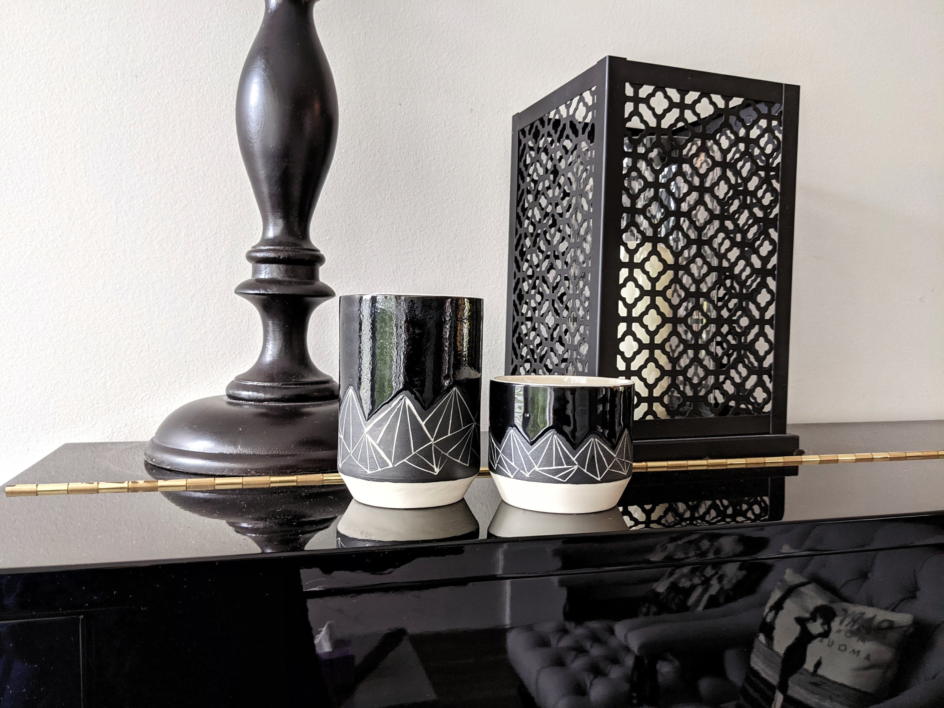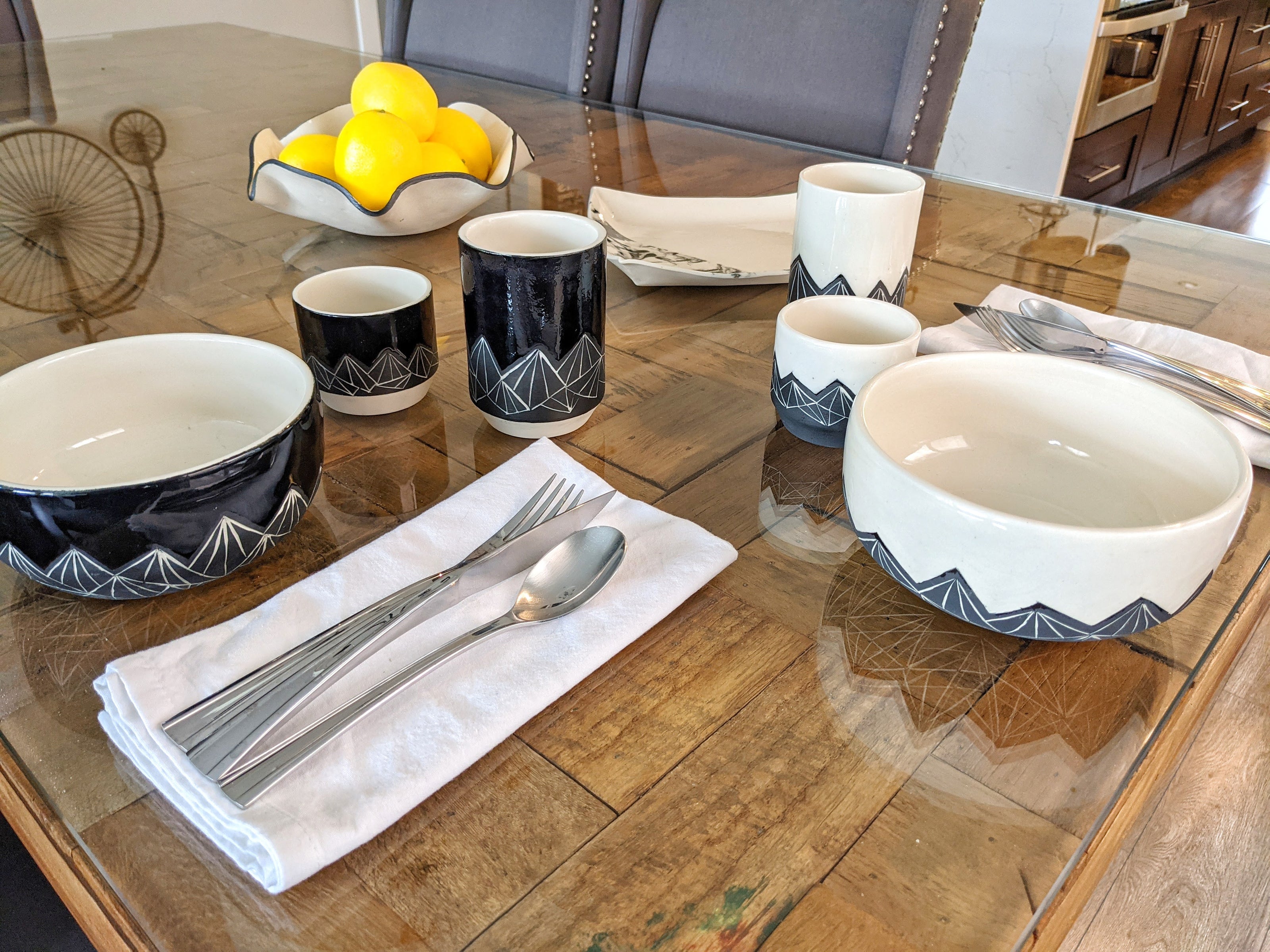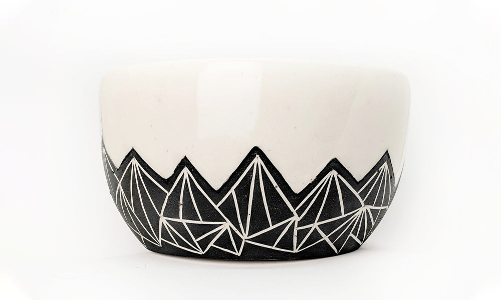 Modern functional pottery with sleek black and white designs. From hand carved geometric mountains to modern hand applied marbling, each series highlights the colours of your food and drink.