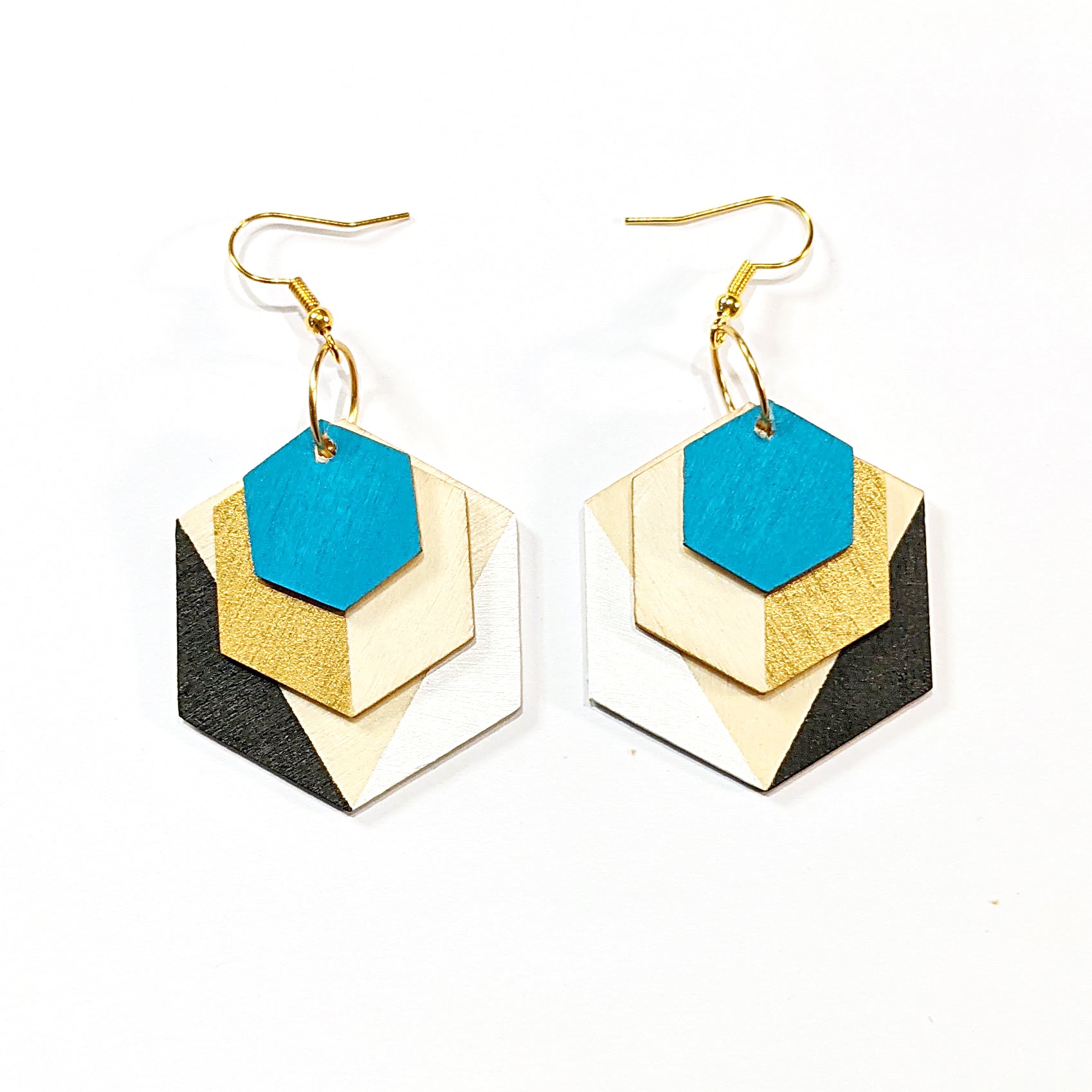 Geometric Wood Colour Block Earrings - Turquoise, Gold and Black